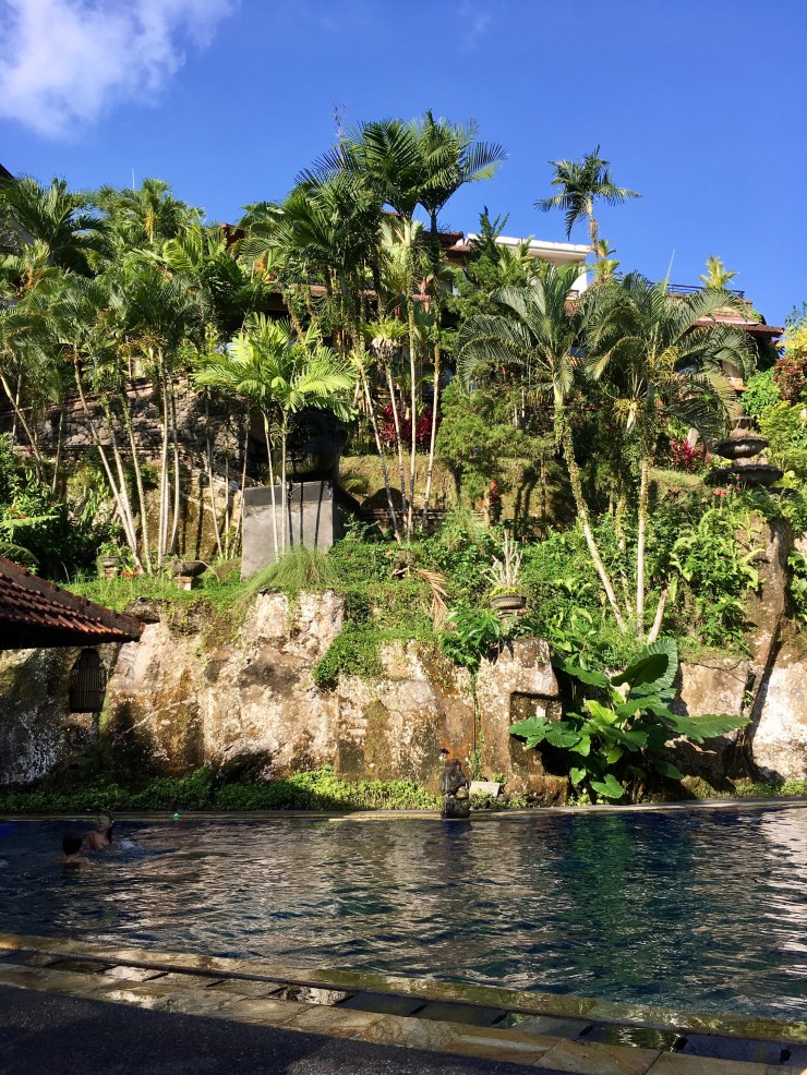 The weather is Ubud is different to Seminyak it can shower at any time, so useful to have an umbrella with you! It’s a consistent 28 degrees which is nice, even when round the pool and it’s raining it’s nice and warm! In the evening’s it cools a few degrees as there’s a gentle breeze through the mountains (not enough to need a jumper) but it’s nice that you can turn your air con off in the rooms. I find a/c gives me a sore throat after a while!