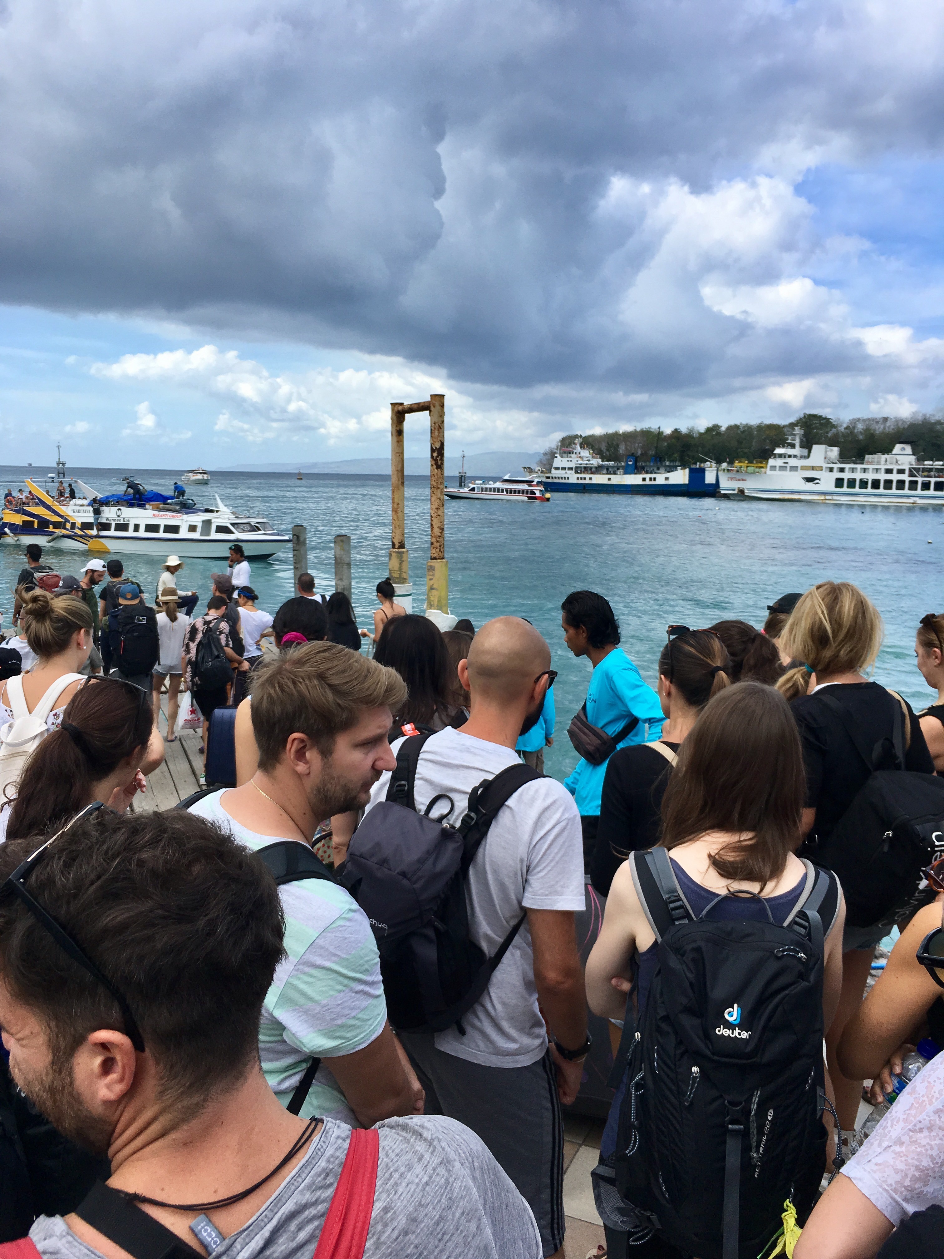 Next morning after not a lot of sleep we went down to the beach early to check in for the boat, said they were running again so we had an hour to kill, went for breakfast, had feet massages and went back down to the boat to be told it’d been pushed back another hour so we found a spot on the beach and chilled out for a very. long. time. After lots of back and forth the boat came at 2pm and it was a free for all to get onto the boat. Once we’d boarded I thought brilliant, 90 mins of feeling sick and we’re back! That however wasn’t the case! The boat went over to Lombok, I assume to drop a couple of people off. Then the boat didn’t move for ages and we were sat bobbing around and sweltering. After a while people started to go upstairs and find out what was going on, there was a lot of heated discussions starting. Basically the boat was apparently 12 people over the limit and the harbour master wouldn’t let us go until 12 people got off. The thing was none of the staff came and told us what the situation was. A few volunteers stepped up, there was talks of everyone chipping in and giving them some money to pay for their hotel in Lombok but we were still 3 short. 10 minutes later a big Geordie lad went upstairs to get to the bottom of what was going on and kept relaying the info back to everyone. Eventually the harbour master agreed to sign some bit of paper allowing us to go so an hour later we set sail again, 9 people over capacity. As we’d left so late the sea was awful, incredibly rough but so hot in the cabin so people were being ill everywhere and you’re not offered water or anything. We had a further 2 hours of this before we pulled up in Pandang Bai where people were fighting to get off the boat. Loads of people had missed flights!